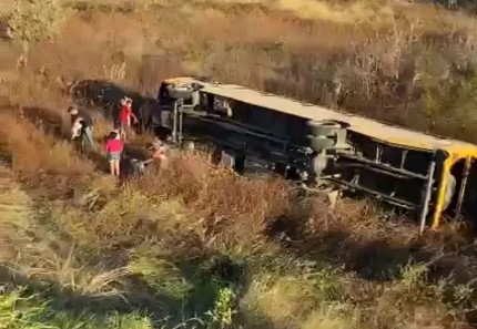 O ônibus desceu um barranco após o motorista perder o controle próximo a um trevo da rodovia. Antes da chegada das unidades de saúde de emergência, populares auxiliaram na retirada das pessoas do veículo.