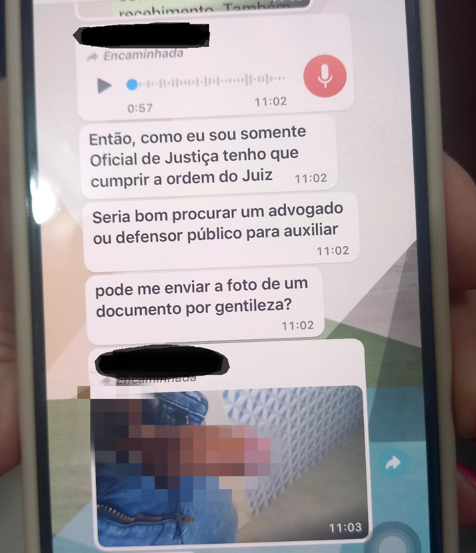 A oficial de Justiça solicitou que o devedor comprovasse o recebimento enviando uma foto do documento e ele mandou uma foto do órgão genital.