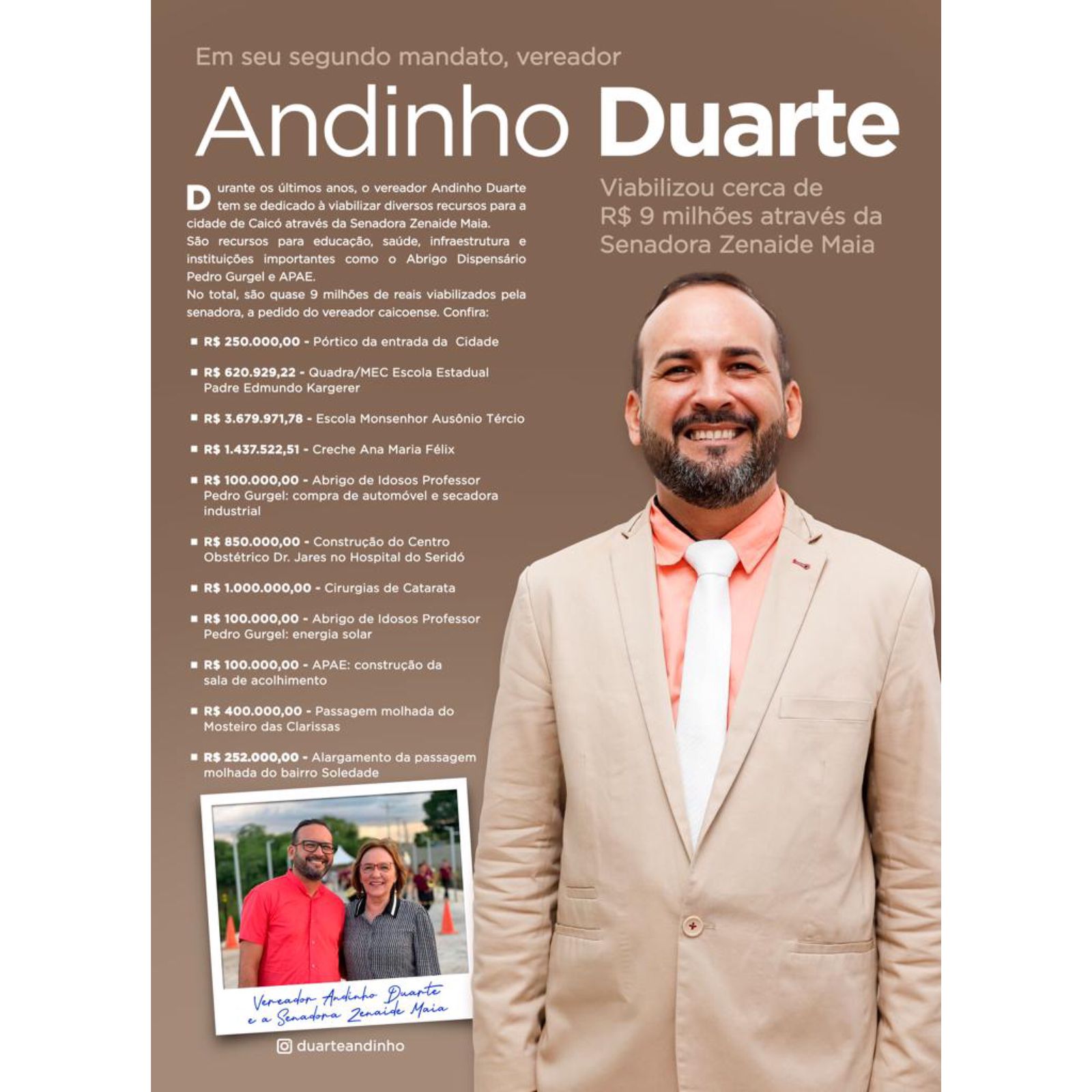 No total são quase 9 milhões de Reais viabilizados pela Senadora Zenaide Maia a pedido do vereador Andinho Duarte.