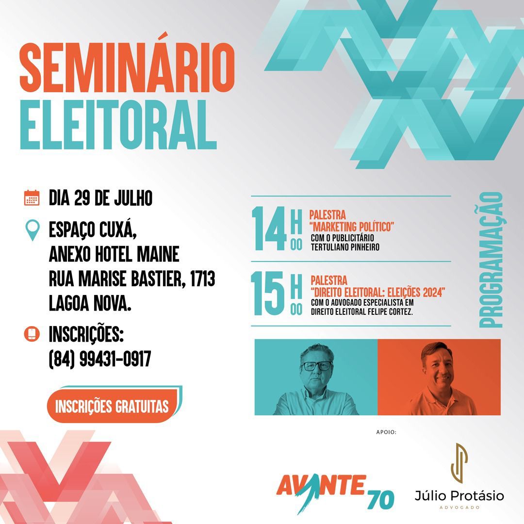 Dando sequência ao ciclo de qualificação para os pré-candidatos a Prefeito (a), Vice-prefeito (a) e Vereador (a) para o pleito 2024, o partido Avante Natal realiza, neste sábado, dia 29 de julho, mais um Seminário Eleitoral. O evento contará com palestras sobre “Marketing Político”, ministrada pelo publicitário Tertuliano Pinheiro, e sobre “Direito Eleitoral: Eleições 2024”, apresentada pelo especialista em Direito Eleitoral, o advogado Felipe Cortez.