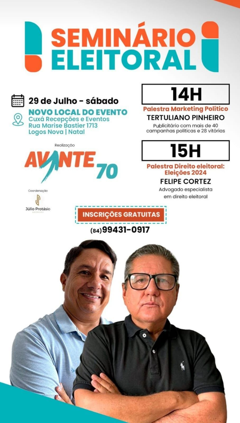 O seminário faz parte de um ciclo de palestras que o partido Avante Natal vai apresentar ao longo do ano e acontecerá no Espaço Cuxá, anexo Hotel Maine, Rua Marise Bastier, 1713, Lagoa Nova. As inscrições são gratuitas e abertas ao público pelo telefone: (84) 99431-0917.