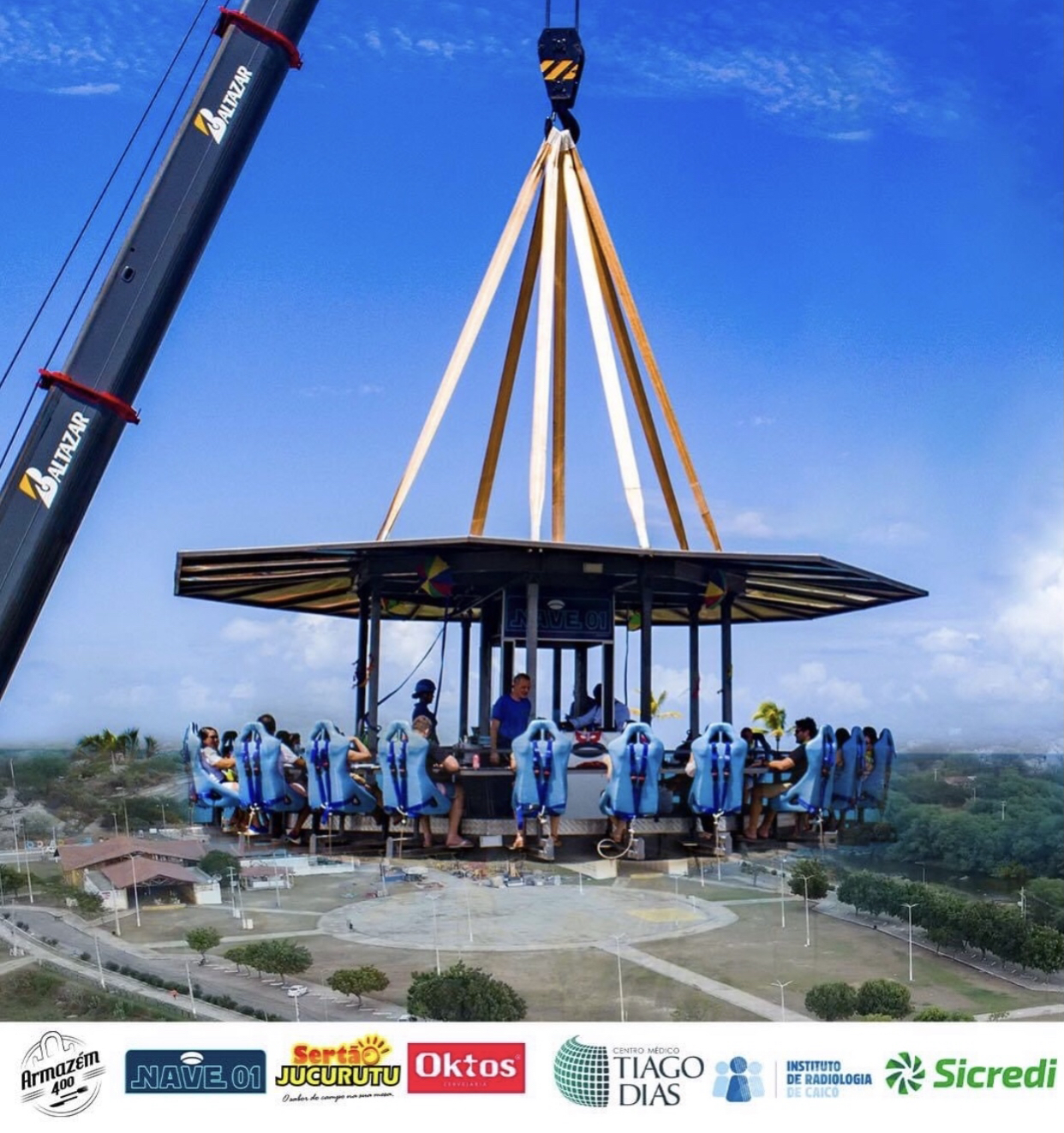 Em formato de nave, com 24 cadeiras, o restaurante é suspenso por um guindaste que leva os participantes às alturas de forma suave, sem que a subida ou descida sejam sentidas. “A segurança e a estabilidade foram os princípios básicos para que a gente pudesse proporcionar uma experiência que alia a gastronomia com a diversão de fazer uma refeição a 20 metros do chão”, comentou um dos sócios do evento Daniel de Oliveira. O anúncio da maior atração da Festa de Sant’Ana foi feita na última quarta-feira (28/06) no Armazém 400 em Caicó e o primeiro lote dos ingressos já começou a ser vendido, no valor de R$195, através da plataforma Eventbrite ou pelo instagram da @nave01oficial e do @armazem400.