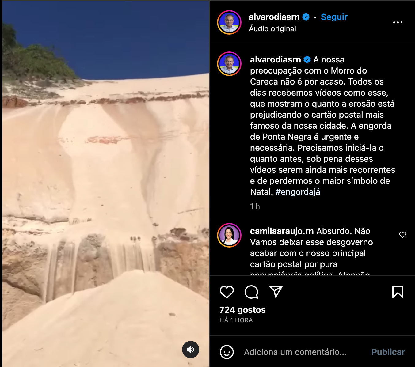 “A nossa preocupação com o Morro do Careca não é por acaso. Todos os dias recebemos vídeos como esse, que mostram o quanto a erosão está prejudicando o cartão postal mais famoso da nossa cidade. A engorda de Ponta Negra é urgente e necessária. Precisamos iniciá-la o quanto antes, sob pena desses vídeos serem ainda mais recorrentes e de perdermos o maior símbolo de Natal. #engordajá”, publicou o prefeito.