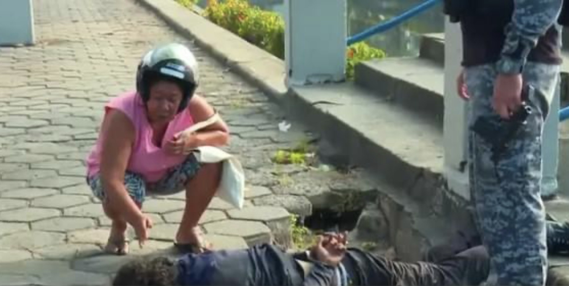 Emocionada, com um capacete de moto na cabeça, ela dizia que o neto tinha que ‘sair dessa vida’, e lembrou que ele tem uma filha.