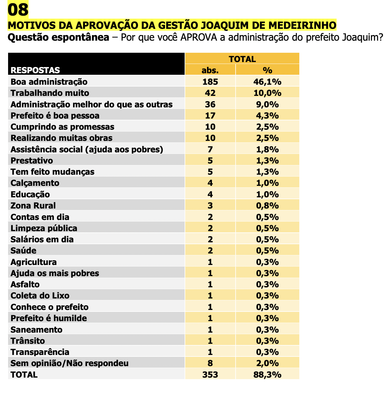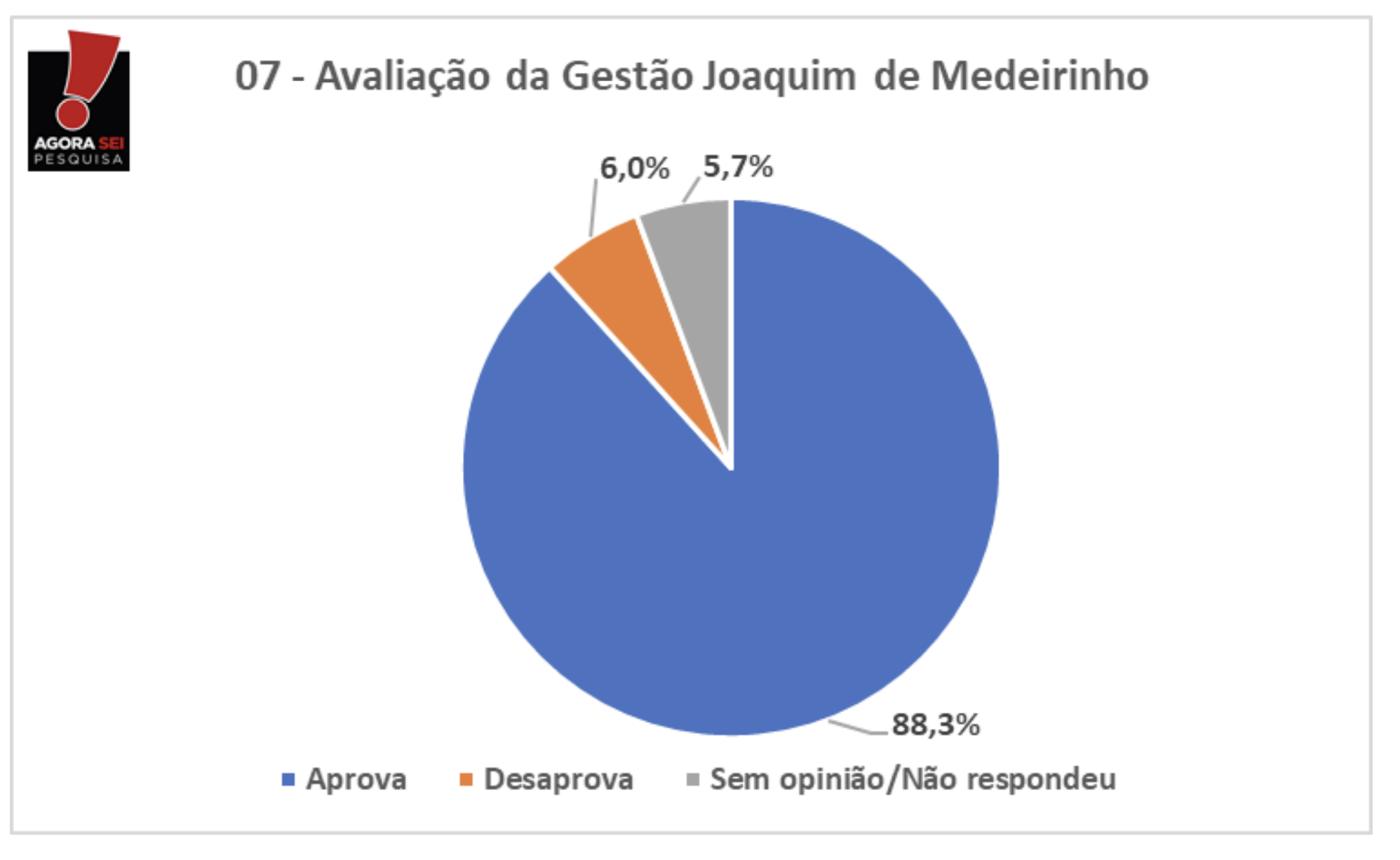 O quesito mais bem pontuado quanto à aprovação de Joaquim de Medeirinho é o de “cumprir com as promessas de campanha”, abaixo da boa administração (com abrangência geral), muito trabalho e administração melhor que as oputras.