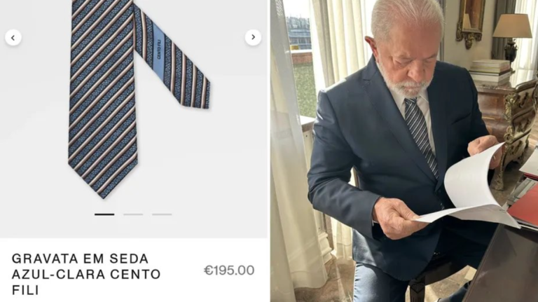 A gravata usada por Lula (PT) no último sábado em agenda internacional em Lisboa foi comprada pela primeira-dama Rosângela da Silva, a Janja, na sexta-feira. A compra do acessório rendeu críticas à mulher do presidente por ter sido efetuada em uma loja de grife, localizada na Avenida Liberdade, a área de compras mais cara da capital portuguesa.