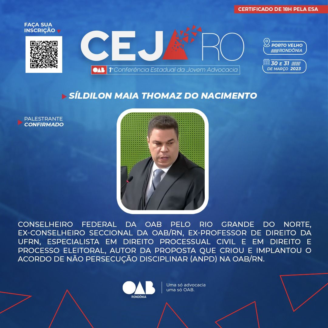 O Conselheiro Federal da Ordem dos Advogados do Brasil pelo Rio Grande do Norte, advogado Síldilon Maia Thomaz do Nascimento, está em Porto Velho, capital de Rondônia, para participar de dois eventos promovidos pela OAB/RO. Hoje (31.03), será palestrante na Conferência Estadual da Jovem Advocacia, com o tema Ética Profissional e Defesa de Prerrogativas. Amanhã (01.04), ministrará curso de formação para os membros do Tribunal de Ética e Disciplina sobre o Acordo de Não Persecução Disciplinar (ANPD).