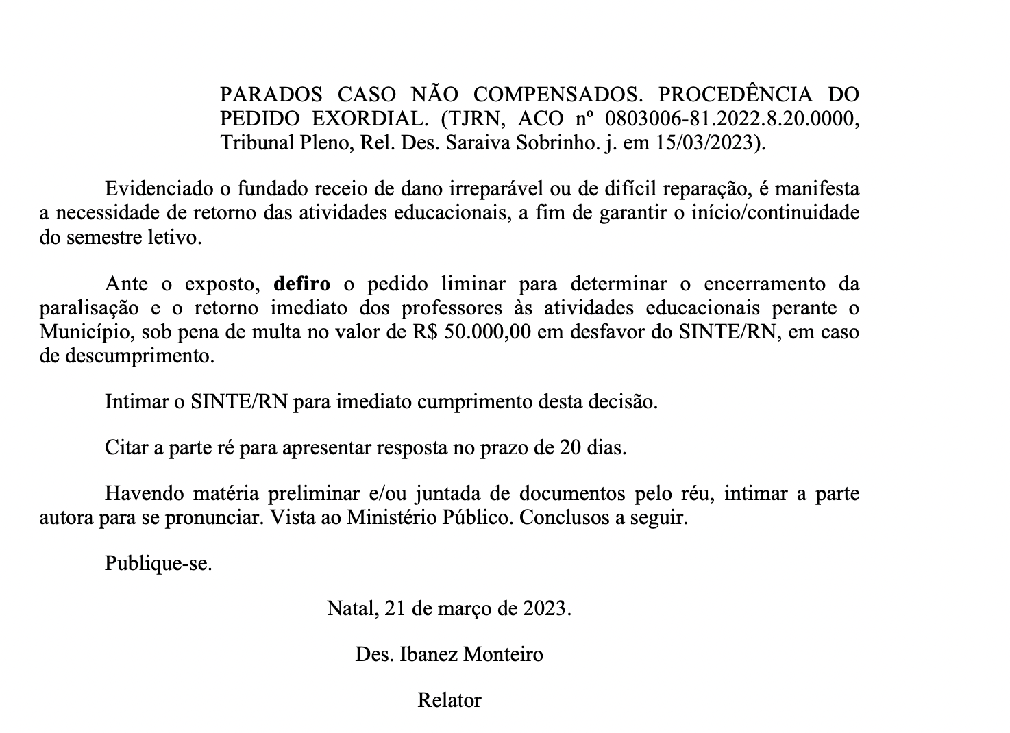 Ante o exposto, defiro o pedido liminar para determinar o encerramento da paralisação e o retorno imediato dos professores às atividades educacionais perante o Município, sob pena de multa no valor de R$ 50.000,00 em desfavor do SINTE/RN, em caso de descumprimento.