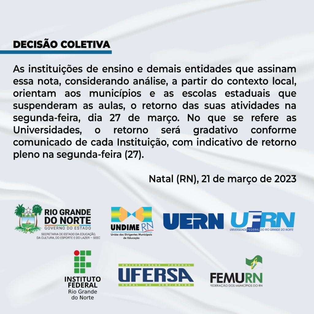 Uma decisão coletiva de instituições estaduais, municipais e federais, divulgada nesta terça-feira (22), orienta o retorno gradativo das aulas no Rio Grande do Norte até a segunda-feira (27). Os trabalhos nas escolas e universidades foram paralisados recentemente devido a onda de ataques criminosos que tem afetado o estado.