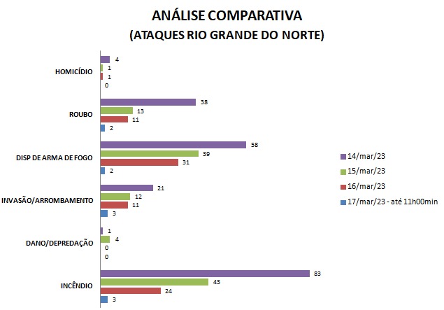 Desde a madrugada de terça-feira (14), cidades potiguares têm incêndios a prédios públicos, veículos e estabelecimentos comerciais. Já são mais de 30 cidades afetadas pela onda de ataques realizados por grupos criminosos. Aulas foram suspensas em diversas cidades. Na capital, a frota de ônibus chegou a ser recolhida, e a coleta de lixo paralisada, devido à insegurança.