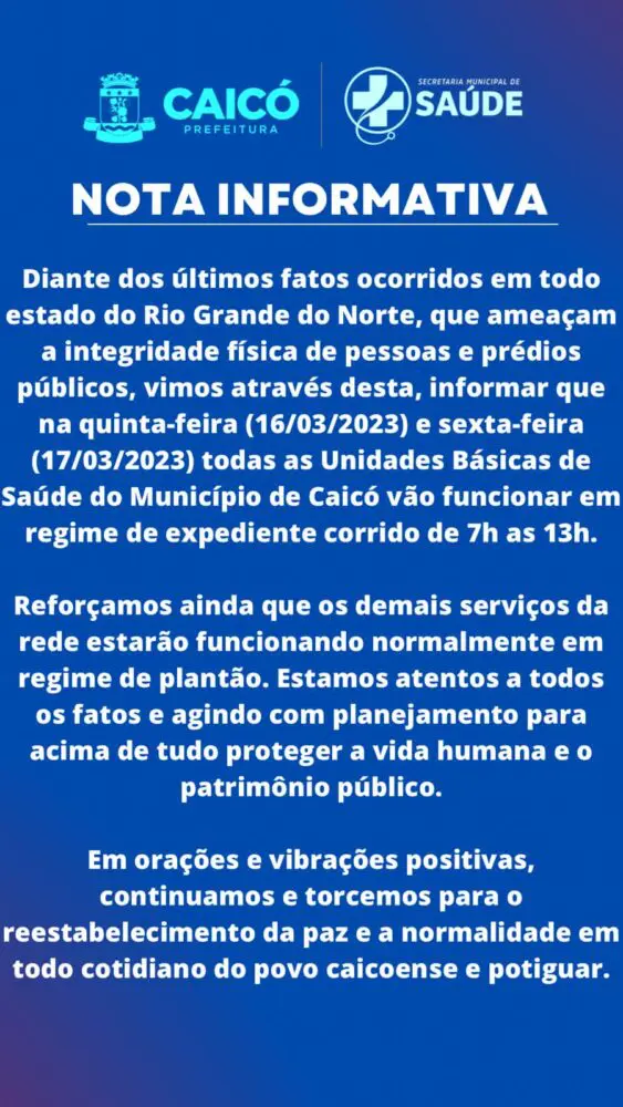 Diante dos atos de depredação ao patrimônio público, ataque da ordem pública e a instabilidade na segurança, a gestão municipal decide pela suspensão das aulas na rede municipal de Caicó e pelo fechamento das bibliotecas e ginásios de esportes no dia de hoje, quinta-feira, 16 de março de 2023. Os fatos serão analisados ao longo do dia e um novo posicionamento será tomado sobre as medidas a serem adotadas proximamente. Outrossim, roga-se a Deus pelo retorno da paz em nosso Estado e pela proteção de todos.