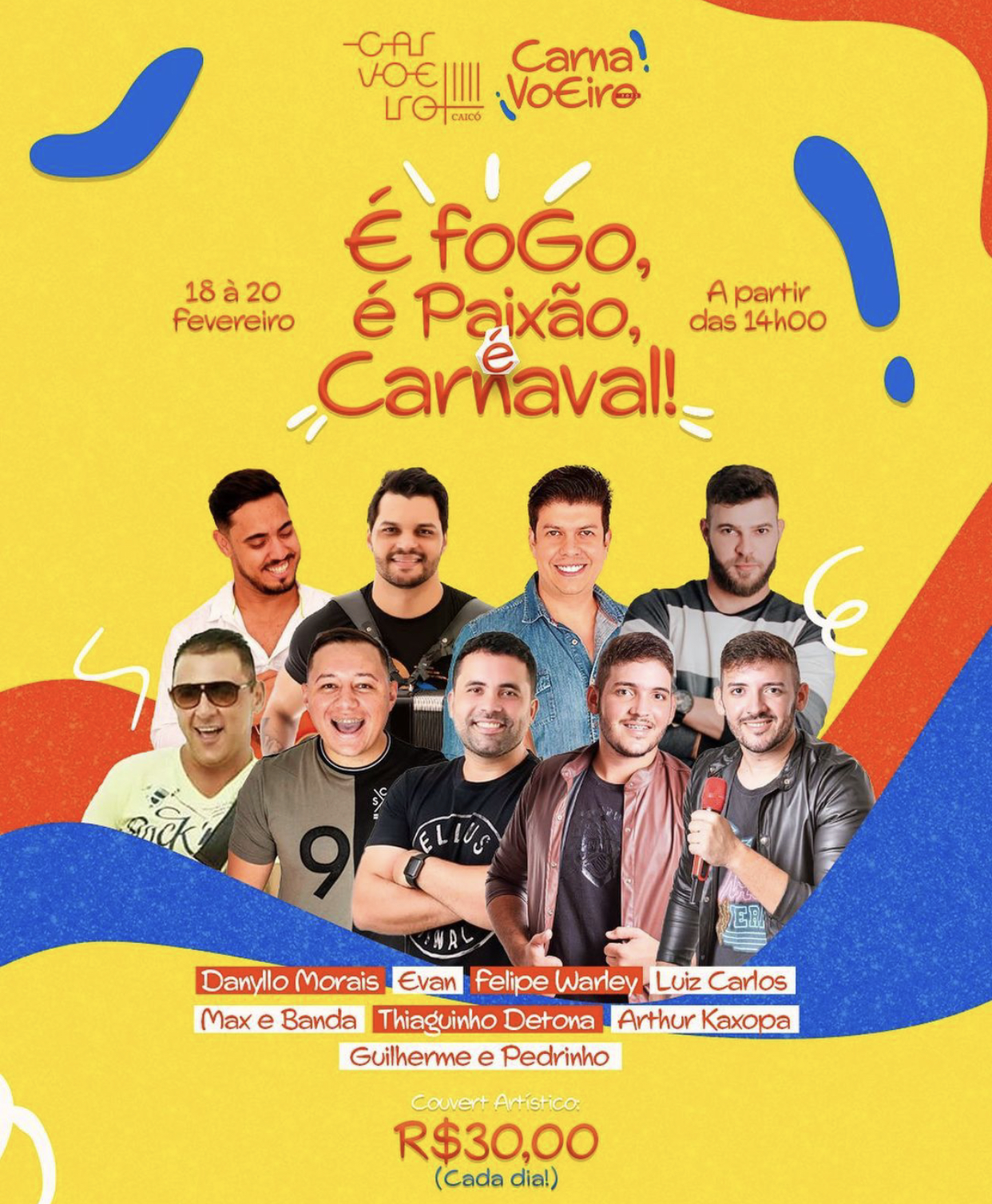 Serão três dias de muita festa no Carnavoeiro, começando no sábado (18) e finalizando na segunda-feira de Carnaval, a partir das 15h e com entrada apenas de R$30,00, cada dia. Você poderá conferir os shows de Arthur Caxopa, Felipe Warley, Thiaguinho Detona, Danyllo Morais, Evan, Max, Luiz Carlos, Guilherme e Pedrinho que trarão muita alegria, curtição e folia no 3° maior Carnaval do Nordeste.
