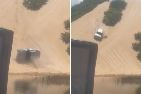 Um acidente impressionante foi registrado nas dunas da região de Búzios, em Nísia Floresta, Grande Natal, na manhã desta quinta-feira (26). Um veículo 4×4 (aparentemente, um Pajeiro) desceu de forma errada a duna e acabou capotando, indo parar só dentro da lagoa.