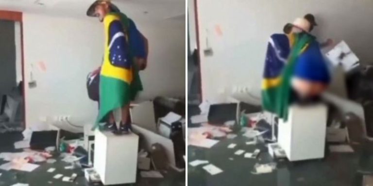 Um vídeo divulgado nas redes sociais mostra um dos vândalos bolsonaristas que invadiram as sedes dos Três Poderes no Distrito Federal supostamente defecando sobre documentos no STF. O homem foi filmado de costas, enrolado na bandeira nacional, com os glúteos à mostra. Internautas apontaram que ele seria funcionário do Banco do Brasil.