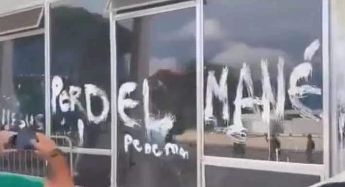 O ministro do Supremo Tribunal Federal (STF) Luís Roberto Barroso ironizou, nesta segunda-feira (9), a pichação feita no vidro frontal da Corte durante os atos golpistas deste domingo (8). O desenho é uma referência a frase dita por Barroso ao ser questionado por um manifestante que apontava fraude nas eleições: “Perdeu, mané”.