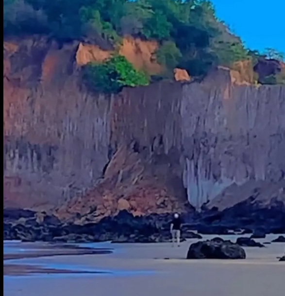 Imagens gravadas no celular por banhistas que estavam no local registraram o momento em que parte da falésia caiu.