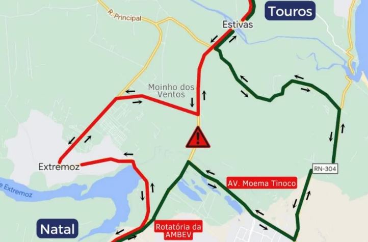 Sentido Touros/Natal: acessar o município de Extremoz pelo Bairro Moinho dos Ventos ou seguir sentido Genipabu, no trevo de Estivas.