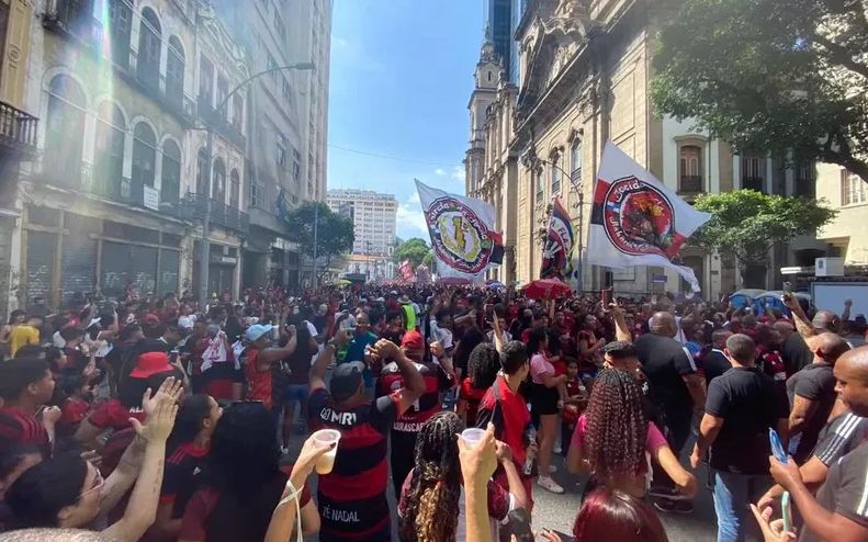 A festa que reuniu centenas de milhares de torcedores do Flamengo entre a manhã e a tarde de hoje (13) terminou com tumulto e correria em ruas do centro do Rio de Janeiro. Os rubro-negros comemoravam os títulos na Libertadores da América e na Copa do Brasil na presença do elenco do clube, que animava a torcida de um trio-elétrico.