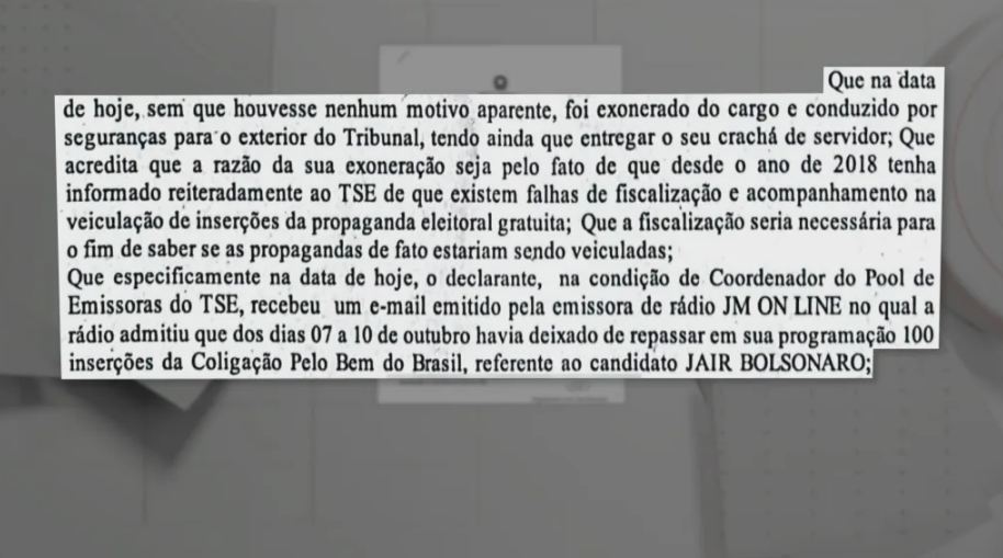 “Eu alertei que o TSE deveria criar alguma maneira para saber se as decisões de suspensão das inserções seriam cumpridas considerando o poder de polícia da Justiça Eleitoral“, disse. Em depoimento prestado à Polícia Federal (PF), ele falou em falhas de fiscalização no “acompanhamento da veiculação das inserções”, e não no controle das peças suspensas.
