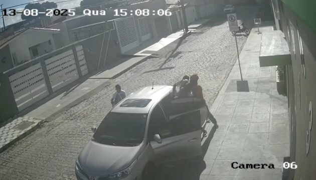 Segundo a Polícia Militar, a vítima foi abordada por quatro homens quando buscava o filho na escola. O crime foi registrado por câmeras de segurança.
