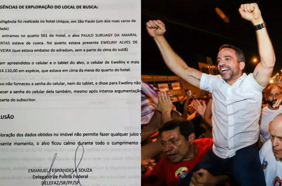 “Ao entrarmos no quarto 501 do Hotel, o alvo Paulo Suruagy do Amaral Dantas estava de cueca. No quarto, estava presente Eweliny Alves de Oliveira (que estava debaixo do edredom, sem a parte de cima do sutiã) [sic]”, relatou o delegado da PF.