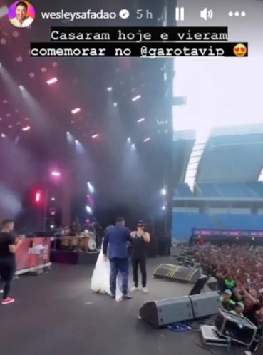Um casal de noivos terminou a festa de casamento em cima do palco do show Garota Vip, com o cantor Wesley Safadão, no início da manhã deste domingo (16), em Natal.