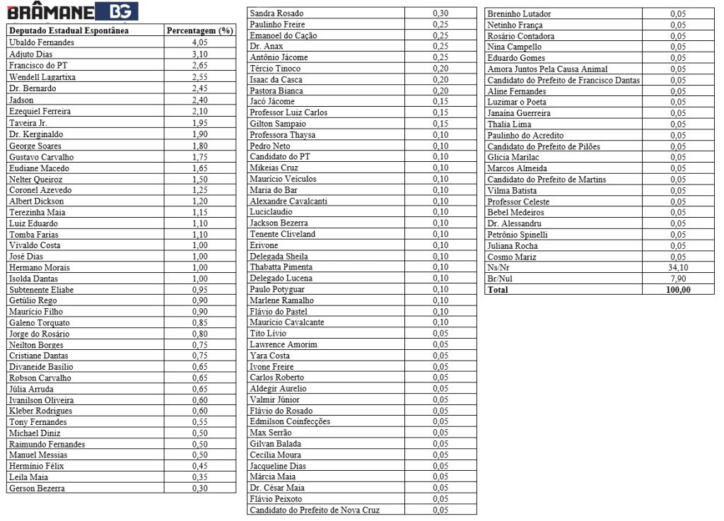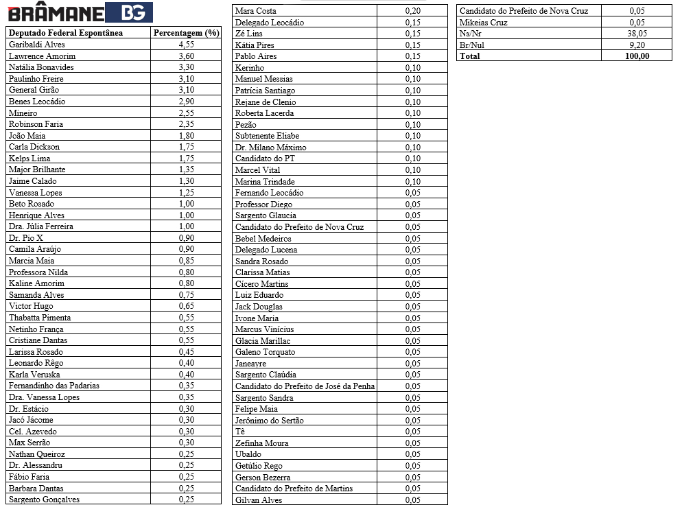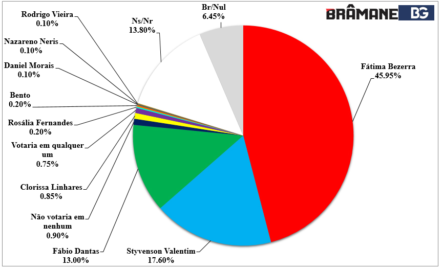 O Instituto Brâmane também fez simulações de segundo turno entre a governadora Fátima Bezerra com os principais nomes na disputa: Styvenson Valentim e Fábio Faria. Em ambos os confrontos, ela sairia vencedora se as eleições fossem hoje.