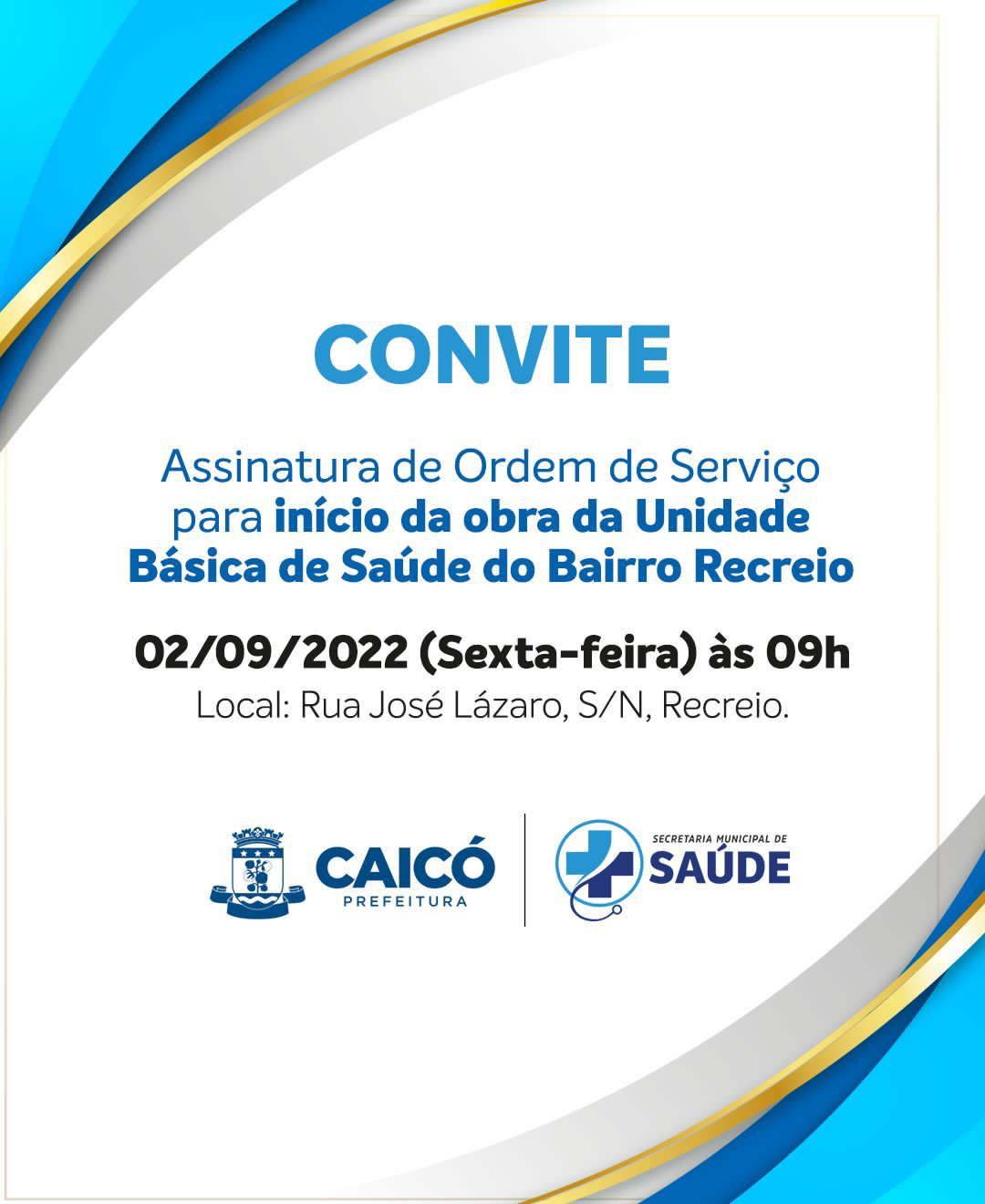O prefeito de Caicó, Dr. Judas Tadeu, anunciou em suas redes sociais, um convite referente a assinatura da ordem de serviço para dar pontapé inicial a obra da Unidade Básica de Saúde do bairro Recreio, zona norte da cidade.