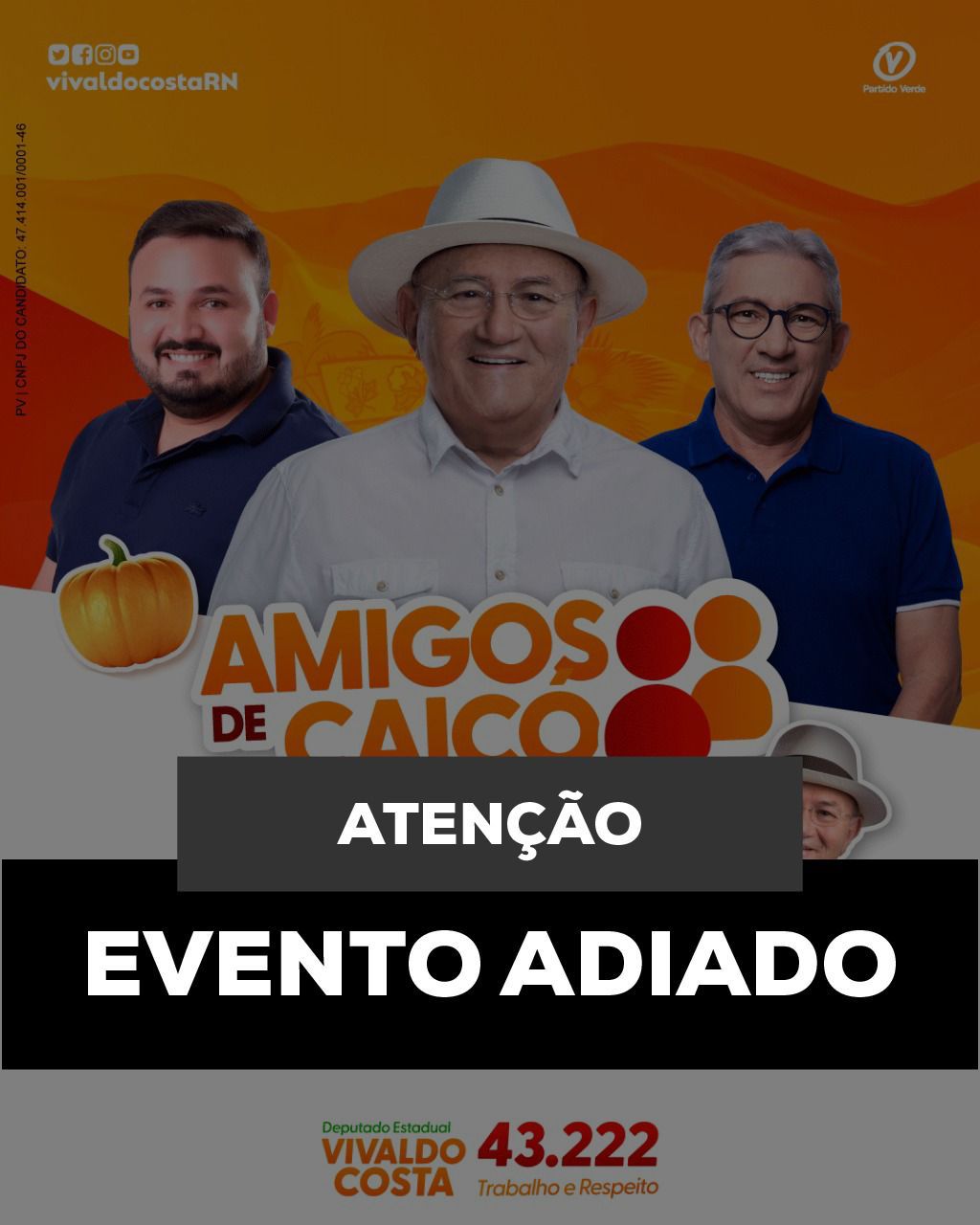 Em virtude do falecimento do ex-vice-prefeito da cidade de Caicó, Emídio Germano Júnior, o evento “Amigos de Caicó” – que seria realizado neste domingo (21) – foi adiado. A decisão foi acordada entre o prefeito Dr. Tadeu, o vice Toinho Santiago, que decretaram luto oficial em todo município, e os deputados Vivaldo Costa e João Maia, além do ex-ministro Rogério Marinho, que participariam do evento.