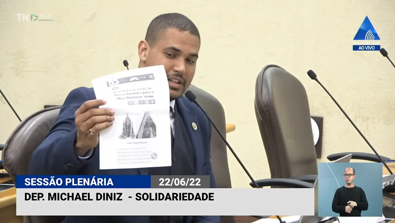 Em seu pronunciamento, o deputado falou sobre um fato noticiado na imprensa que tratava de uma miss trans que posou para uma sessão de fotos como Maria, a mãe de Jesus. Para ele, a atitude representa “um fardo nas costas” nos conservadores e “chacota” contra os cristãos.