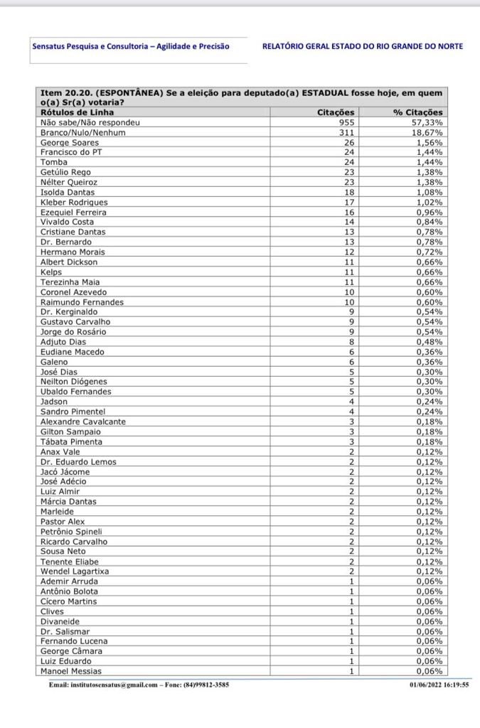 A Band RN divulgou, na noite desta quinta-feira (2), pesquisa de intenção de votos para deputado estadual realizada pelo instituto Sensatus Pesquisa e Consultoria. No levantamento estatístico, de forma espontânea, o deputado estadual e pré-candidato a reeleição, Vivaldo Costa aparece entre os nove nomes mais citados na disputa por uma cadeira na Assembleia Legislativa.