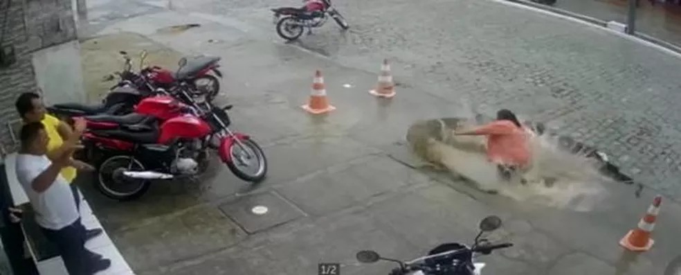 A gari que foi “engolida” por um buraco cheio de água relatou o susto com o acidente. A mulher caminhava por uma calçada quando parte do chão abriu, e ela acabou caindo.