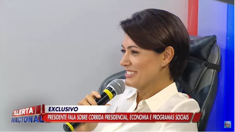 A primeira-dama Michelle Bolsonaro (PL) fez uma breve participação no programa Alerta Nacional, da RedeTV, apresentado por Sikêra Jr. O entrevistado do dia era o presidente Jair Bolsonaro (PL) mas, provocada pelo apresentador, Michelle disse que o marido é “imbrochável”.