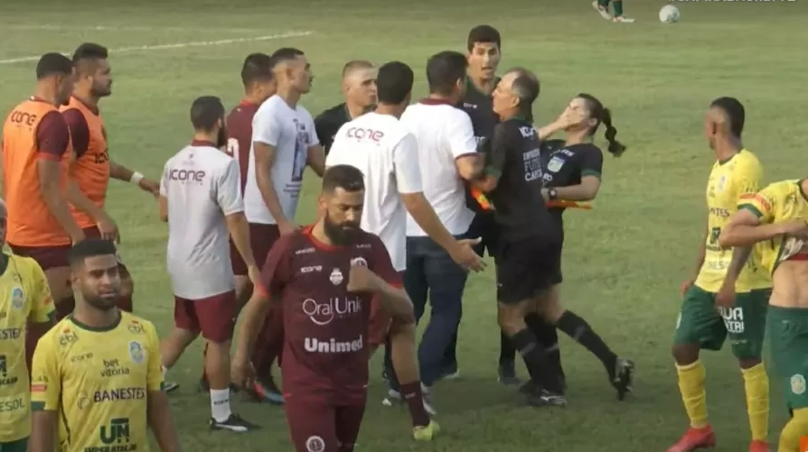 O técnico da Desportiva Ferroviária (ES) acaba de AGREDIR a auxiliar de arbitragem da partida pelas quartas de final do campeonato capixaba. Espero que o STJD e a @CBF_Futebol apliquem o banimento desse bandido, que deve responder na justiça comum. pic.twitter.com/iJ6ZpnQNPW