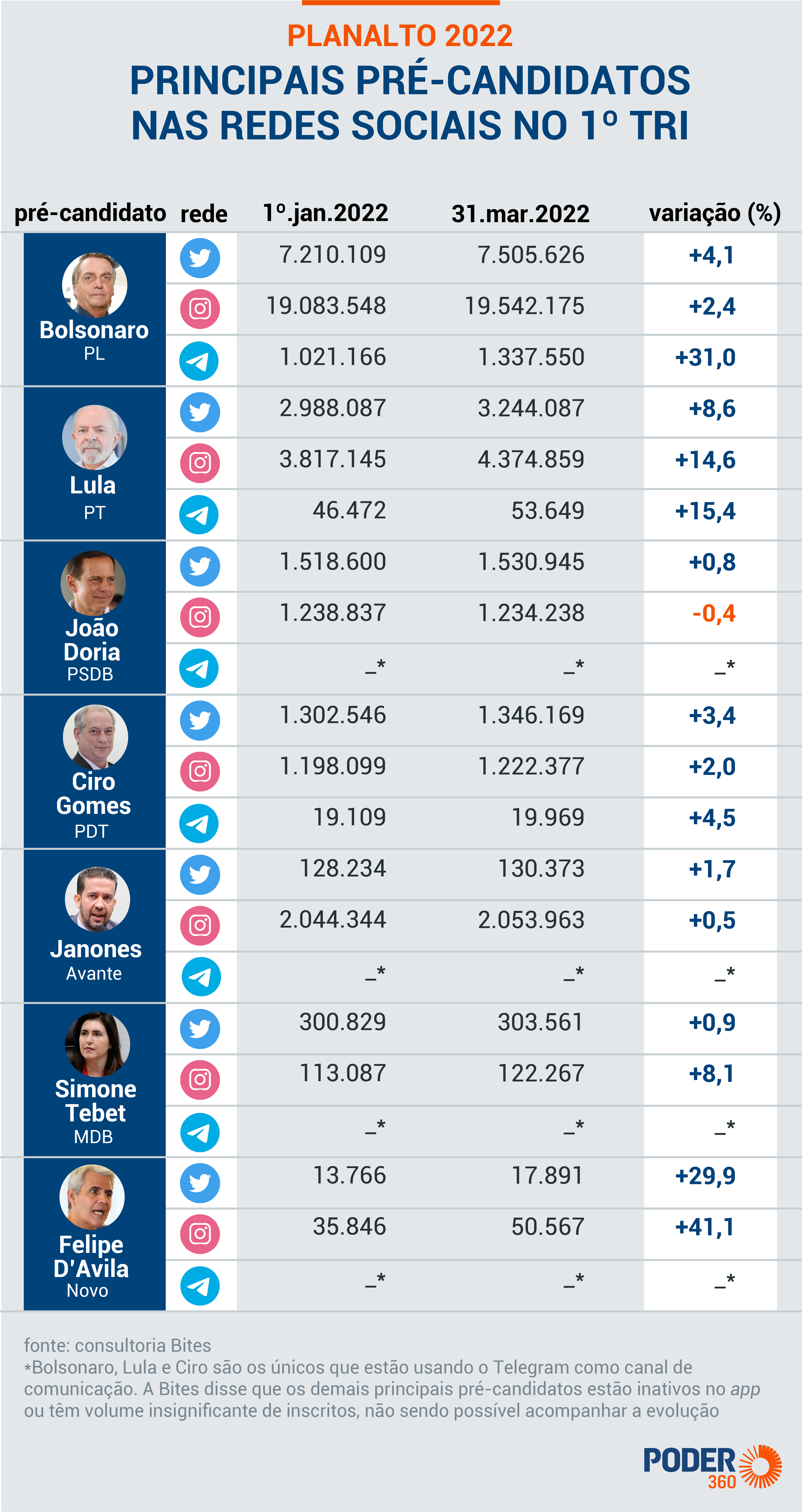 Faltando menos de 6 meses para as eleições de outubro, o presidente Jair Bolsonaro (PL) segue liderando com folga em número de seguidores nas redes sociais. Fechou o 1º trimestre de 2022 com 21 milhões a mais que o ex-presidente Luiz Inácio Lula da Silva (PT), considerando Twitter, Instagram e Telegram. Porém, apesar da liderança esmagadora, o petista ganhou mais seguidores no Twitter e no Instagram no período.