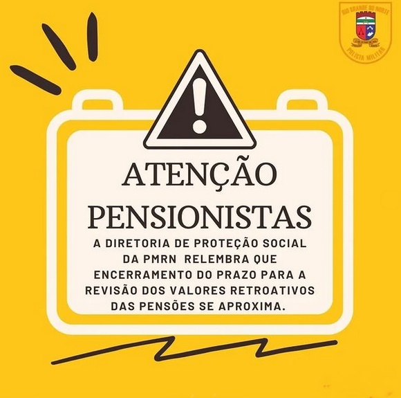 O Diretor de Proteção Social da Polícia Militar do Rio Grande do Norte vem relembrar que o prazo para a solicitação de revisão das pensões militares, previsto no art. 5º, da Lei Complementar Nº 692, de 28 de dezembro de 2021, encerra-se no dia 29 de março de 2022 (terça-feira), conforme o art. 31, da Lei Complementar Nº 692, de 28 de dezembro de 2021, que dispõe sobre o Sistema de Proteção Social dos Militares do Estado do Rio Grande do Norte (SPSM/RN).