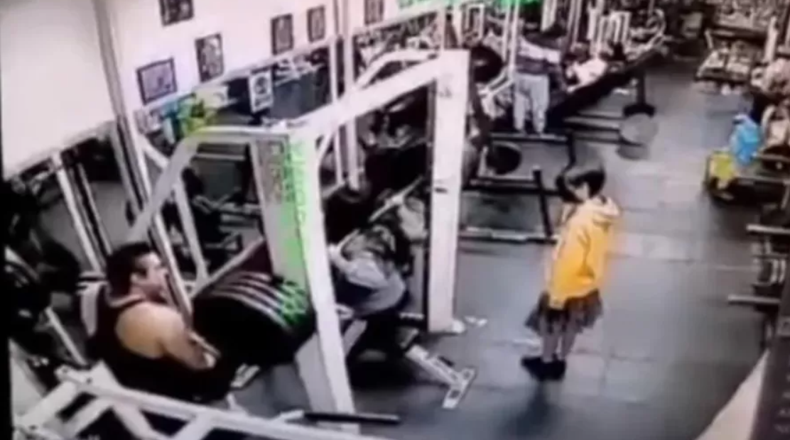 As imagens fortes mostram um homem checando os pesos enquanto a mulher, que não teve o nome revelado, aguarda com a filha. No momento seguinte, ela se dirige ao aparelho e, na primeira tentativa de erguer a barra, é empurrada com força para baixo, atingida no pescoço.