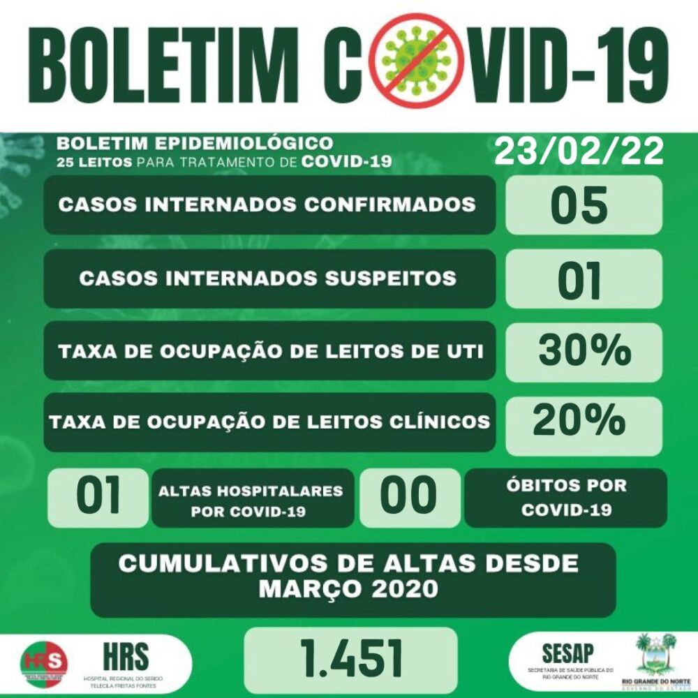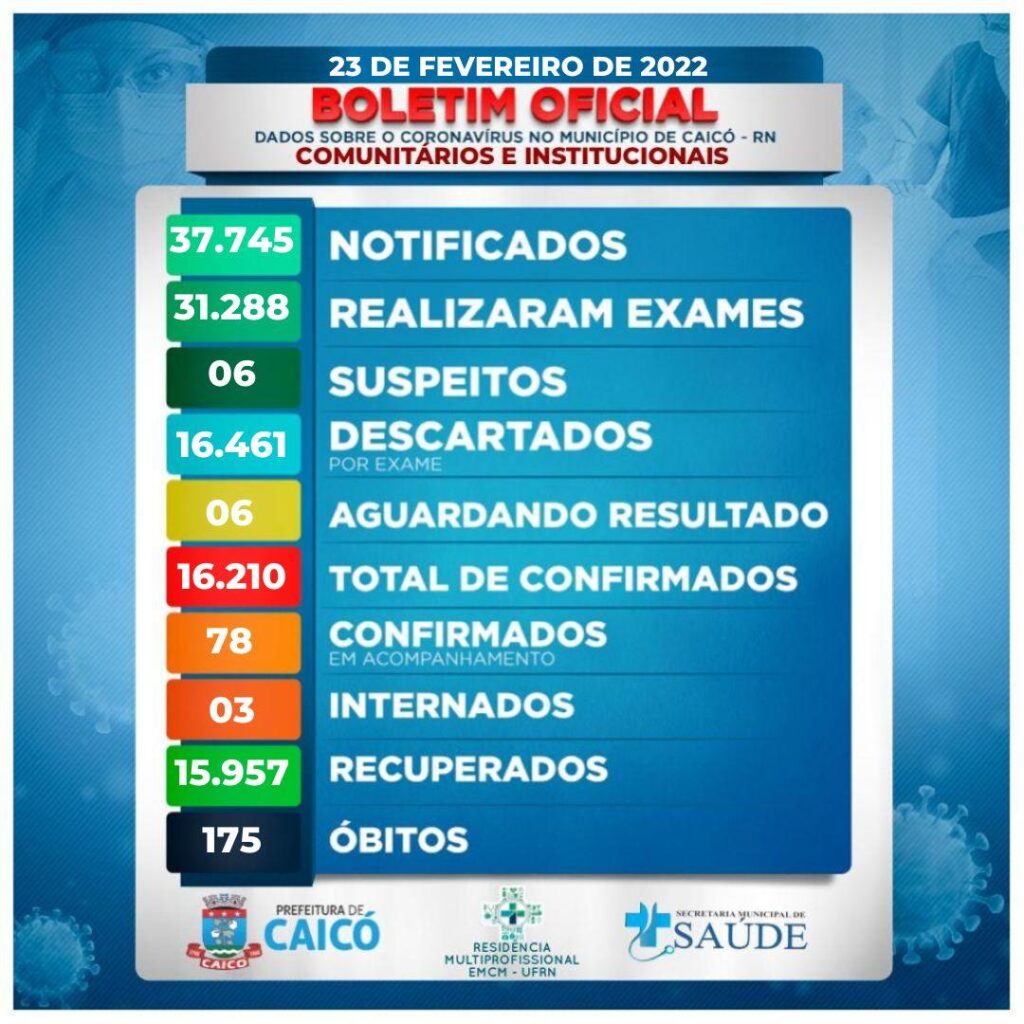 Nesta quarta-feira (23/02/2022), a Secretaria Municipal de Saúde vem por meio desta comunicar que, no dia de hoje, tivemos 24 casos confirmados de Covid-19, sendo 09 homens e 15 mulheres.