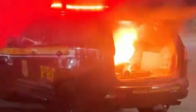 Uma viatura da Polícia Rodoviária Federal (PRF) foi incendiada nesta segunda-feira (7) em frente à Delegacia de Polícia Civil de Ouricuri, no Sertão do Araripe.