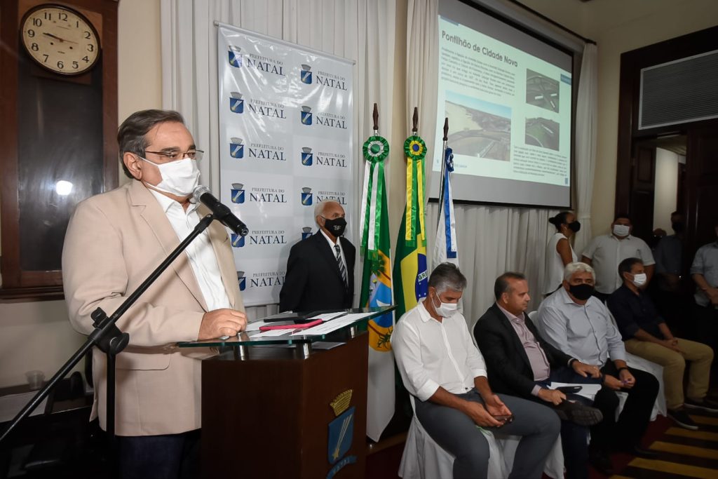 A prefeitura de Natal celebrou nesta sexta-feira (11) um convênio com o Ministério do Desenvolvimento Regional (MDR) que vai permitir a realização de obras de mobilidade urbana, recuperação de áreas turísticas e drenagem de águas pluviais em Natal. O anúncio dos repasses aconteceu no salão nobre do Palácio Felipe Camarão, pelo prefeito Álvaro Dias, pelo ministro do Desenvolvimento Regional Rogério Marinho, e pelo secretário de Habitação do Governo Federal, Alfredo Pontes. A solenidade contou com a presença de secretários, de autoridades do legislativo municipal e lideranças comunitárias.