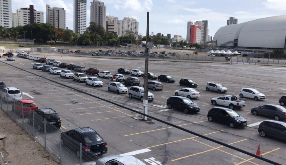 Uma longa fila de carros começou a se formar logo cedo em volta da Arena das Dunas, em Natal, onde funciona um ponto de testagem para Covid-19 montado pela prefeitura de Natal.