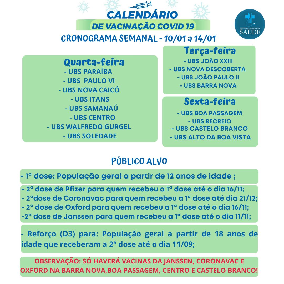 A dose de reforço (D3) é para a população geral a partir dos 18 anos de idade que recebeu a segunda dose até o dia 11 de setembro. O calendário traz uma observação que só haverá vacinas da Janssen, Coronavac e Oxford na Barra Nova, Boa Passagem, Centro e Castelo Branco.
