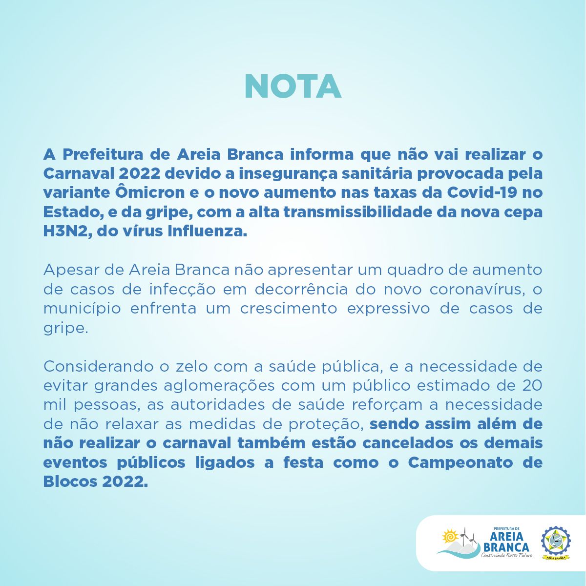 A Prefeitura de Areia Branca informou que não vai realizar o Carnaval 2022. O motivo relatado pelo Executivo foi “a insegurança sanitária provocada pela variante Ômicron e o novo aumento nas taxas da Covid-19 no Estado, e da gripe, com a alta transmissibilidade da nova cepa H3N2, do vírus Influenza”. O anúncio ocorreu na manhã deste sábado (8).