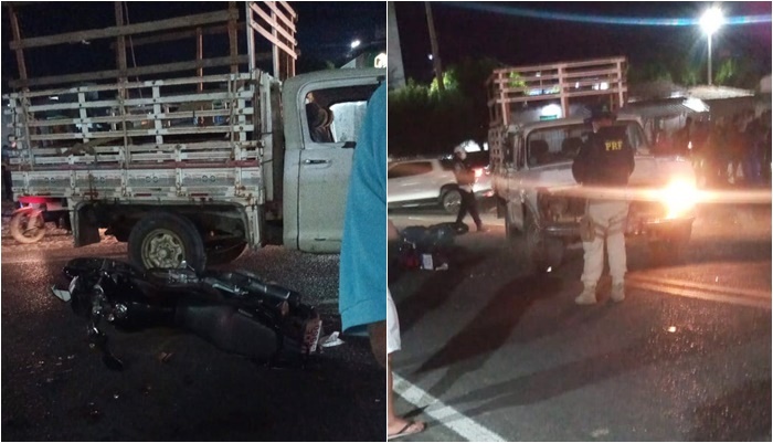 Um veículo tipo caminhonete se envolveu em sinistro com uma moto. A colisão lateral levou o motoqueiro ao chão, assim como seu equipamento. Não foi repassado pela PRF qual dos dois condutores ocasionou o acidente.