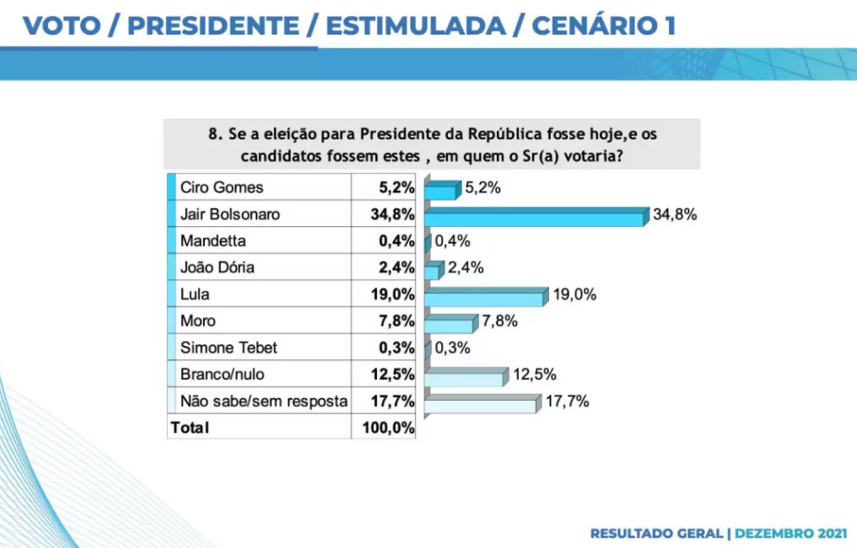 Ele lidera as intenções de votos para o primeiro turno com 34,8%, seguido pelo ex-presidente Lula (PT), com 19%. Brancos/nulos (12,5%) e aqueles que não sabem/indecisos (17,7%) representam 30,2% do eleitorado.
