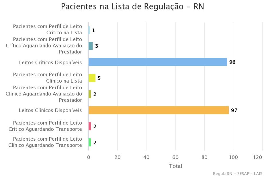 Neste período, havia 01 paciente com perfil para leitos críticos na lista de regulação e 03 aguardavam avaliações. Foram registrados disponíveis 96 leitos críticos e outros 97, sendo clínicos.