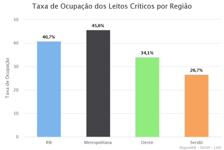 Segundo a Sesap, a Região metropolitana apresenta 45,6% dos leitos críticos ocupados, a região Oeste tem 34,1% e a Região Seridó tem 26,7%.