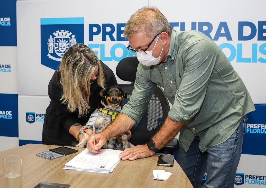 Uma cachorra foi levada à Prefeitura de Florianópolis para “assinar” um projeto de lei sobre a leishmaniose visceral, doença que atinge cães e humanos. Many, como é chamada, teve a pata carimbada no documento. A proposta prevê que tutores de baixa renda que optarem por tratar o animal recebem do município o medicamento necessário. A cerimônia de assinatura do projeto de lei ocorreu na manhã desta quarta-feira (10).
