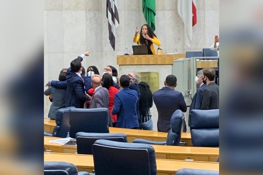 Enquanto a vereadora realizava seu discurso, o relator da proposta Rubinho Nunes a interrompeu com contrapontos. A atitude desencadeou uma resposta da parlamentar e a confusão começou.
