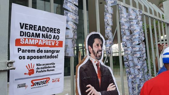 Servidores públicos municipais entraram em confronto com policiais militares e guarda civis metropolitanos nesta quarta-feira (10) durante protesto em frente à Câmara Municipal de São Paulo, no Centro da cidade, contra a Reforma da Previdência Municipal proposta pelo prefeito Ricardo Nunes (MDB). Por volta das 16h30, houve um primeiro confronto com a Guarda Civil Metropolitana (GCM). Os manifestantes jogaram ovos, garrafas e mastros da bandeira contra o prédio da Câmara e os guardas revidaram com bala de borracha.